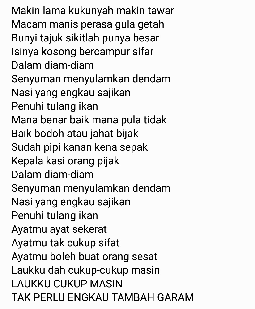 Laukku dah dah cukup masin Laukku cukup masin Tak perlu engkau tambah garam Laukku dah cukup cukup masin Laukku cukup masin Tak perlu engkau tambah garam Ayatmu ayat sekerat. Isinya kosong bercampur sifar. Bunyi tajuk sikitlah punya besar.